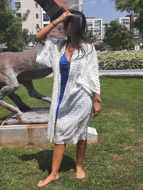 GİZMOSSE ÖZEL TASARIM BEYAZ TÜL ÜZERİNE 3 BOYUTLU KARE ŞEKİL KİMONO