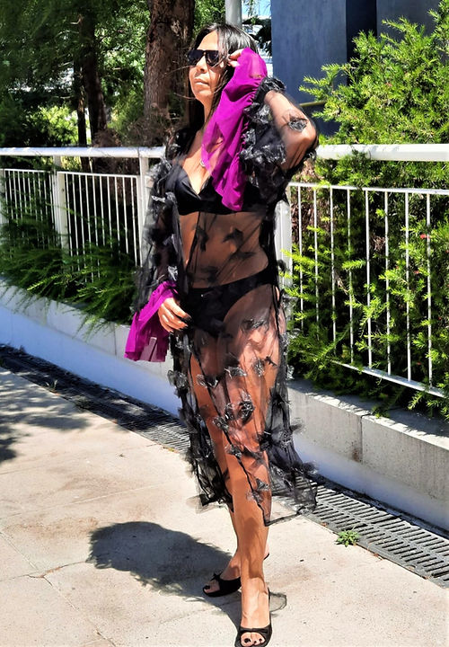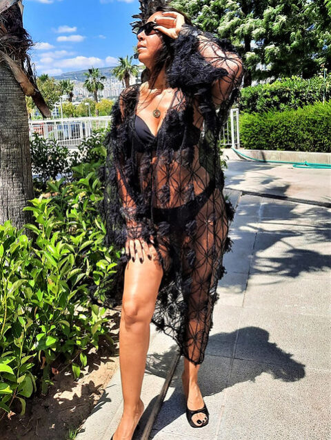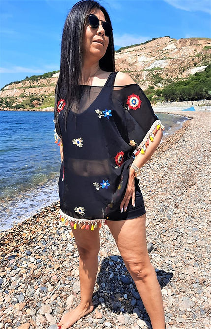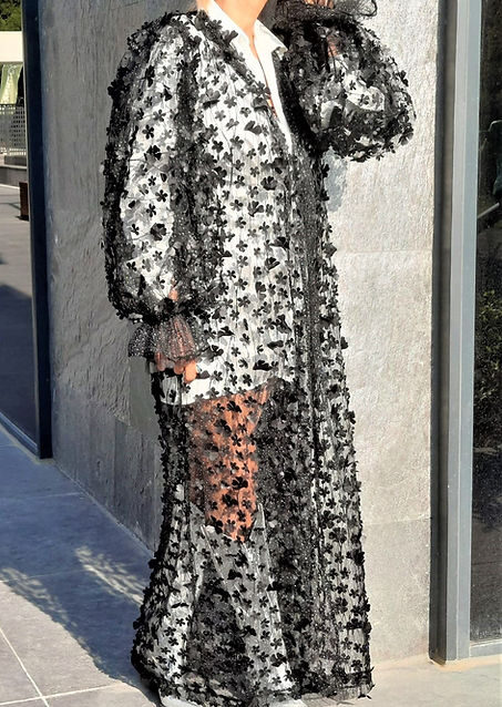 GİZMOSSE ÖZEL TASARIM SİYAH ÇİÇEK DETAYLI TÜL KİMONO