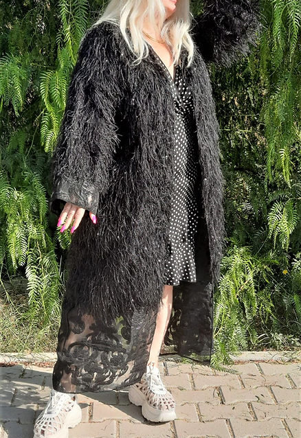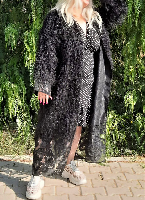 GİZMOSSE ÖZEL TASARIM SİYAH TÜY DETAYLI BÜYÜK BEDEN DIŞ GİYİSİ