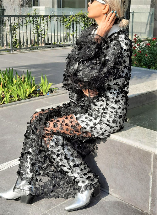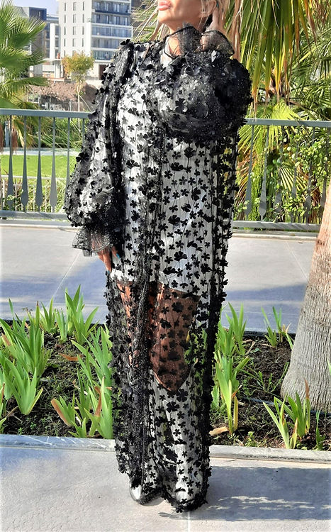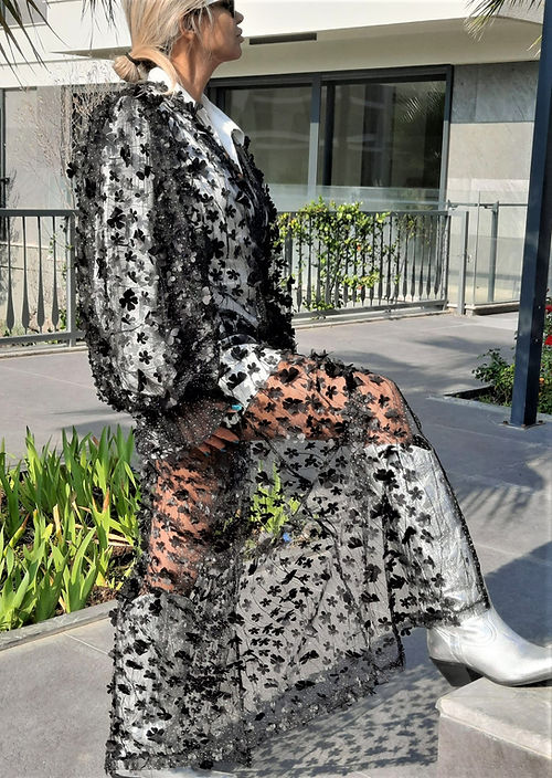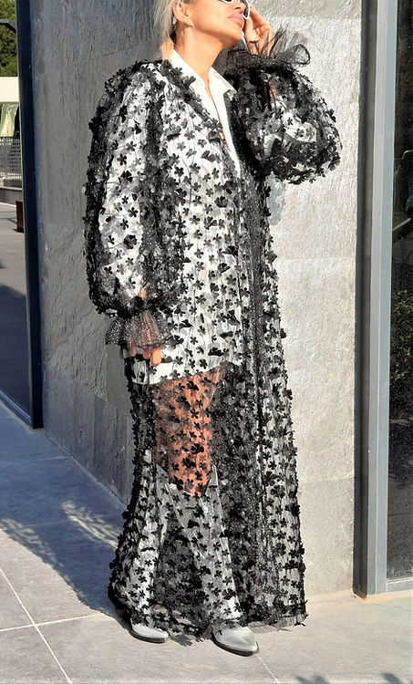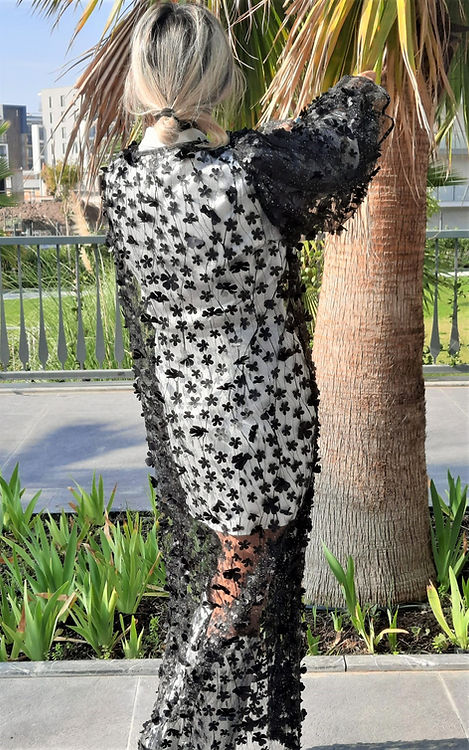 GİZMOSSE ÖZEL TASARIM SİYAH ÇİÇEK DETAYLI TÜL KİMONO
