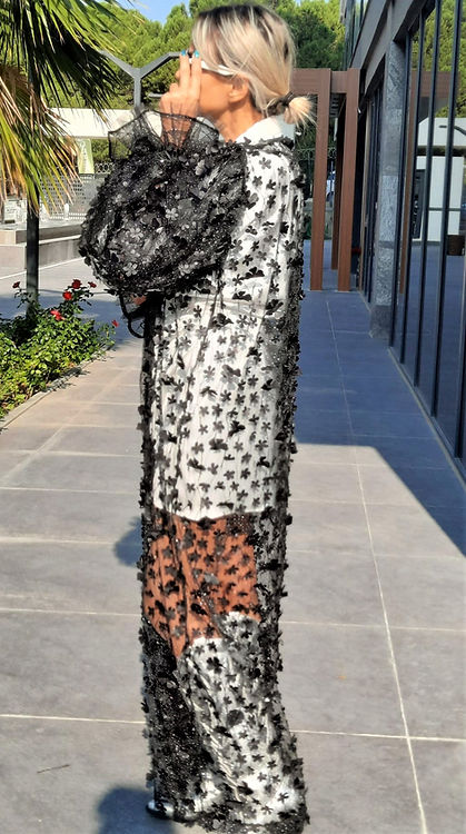 ÖZEL TASARIM OLARK HAZIRLANMIŞ ÜNLÜ BİR MARKANIN ÖZEL KUMAŞI İLE ÇALIŞILMIŞ TÜL ÜZERİN DE SİYAH ÇİÇEK İŞLEMELİ 3 BOYUTLU GECE VE GÜNDÜZ ŞIK DAVETLER DE AYRICA PLAJ DA MAYO BİKİNİ ÜSTÜNE GİYİLEBİLECEK TARZINIZI YANSITAN BİR KİMONO. 42 44 46 BEDEN İÇİN UYGUNDUR. KOLLARI ÇİFT TÜL VE VALONLUDUR. TEK DİKİLMİŞTİR. EŞİ YOKTUR.