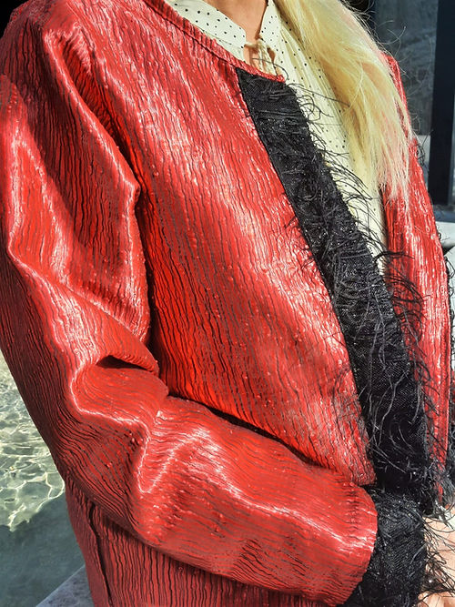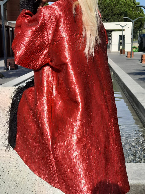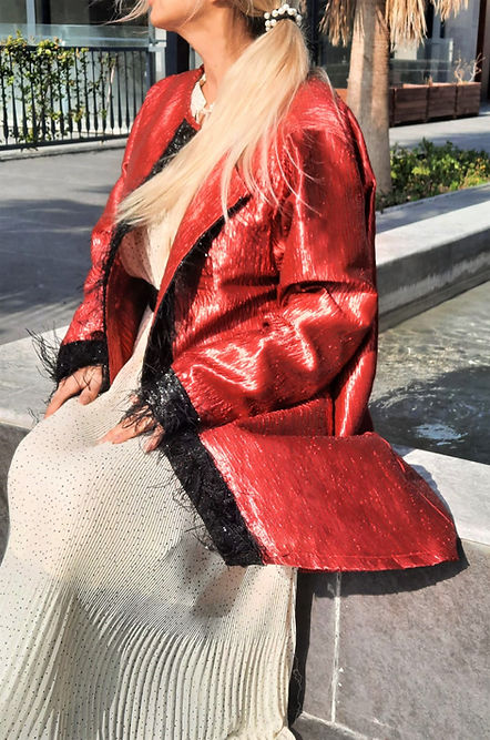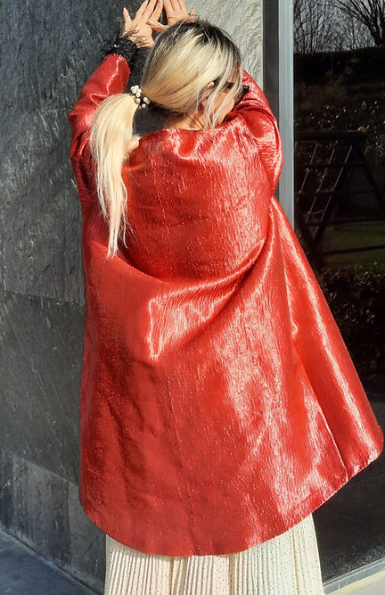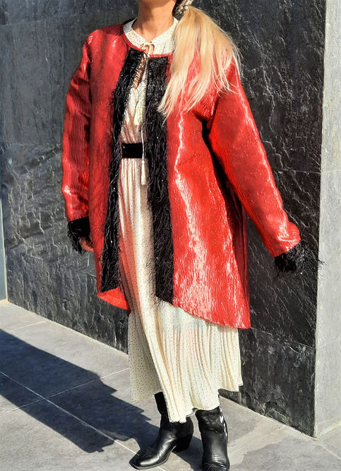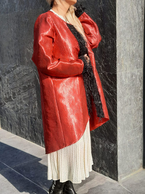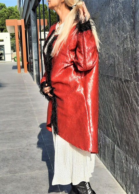 ÖZEL TASARIMDIR. TEK DİKİLMİŞTİR. ÖZEL BİR MARKANIN KUMAŞIDIR. BİRKAÇ BEDEN GİYEBİLECEK ŞEKİLDE DİKİLMİŞTİR. 42 44 46 BEDEN GİYEBİLİR. PARLAK SATEN PAMUK KARIŞIMI TOK BİR KUMAŞTIR. KENARLARI TÜY BİYEDİR. GECE DAVETLER VE YEMEKLER DE DIŞ GİYİSİ OLARAK GİYİLEBİLECEK ŞIK BİR ÜRÜNDÜR.